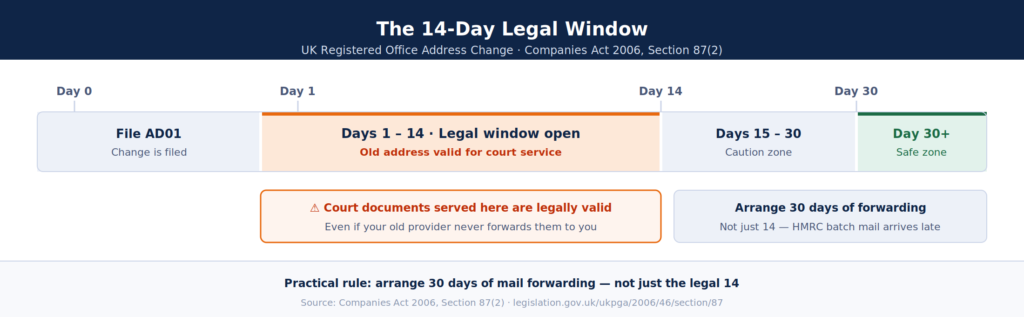 During those 14 days, anyone — a creditor, a claimant, a solicitor acting for someone who has a dispute with your company — can legally serve documents on your company at your old address. The court will treat that as valid service. The company cannot argue otherwise.
